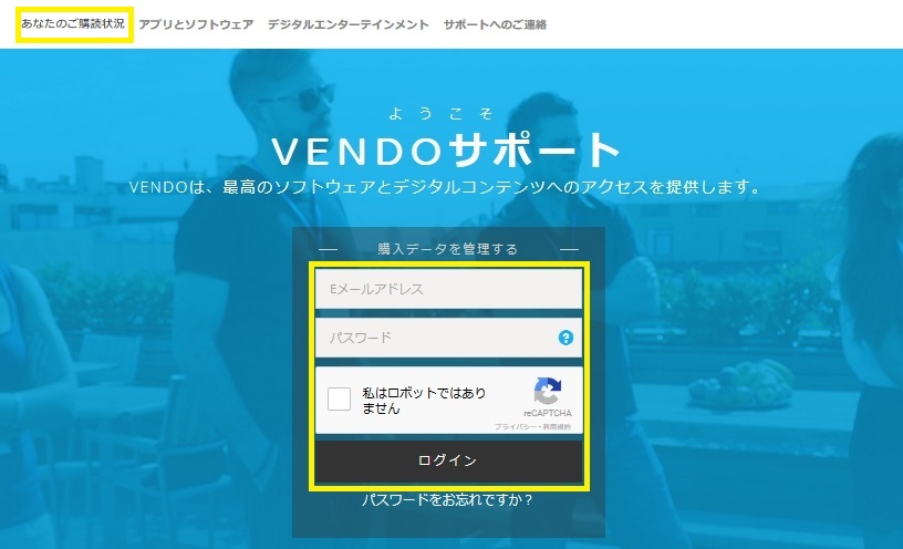 コンタクト(Contact)をクリック。Vendoのサポートページに移動